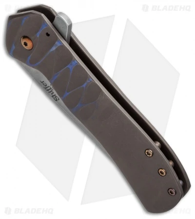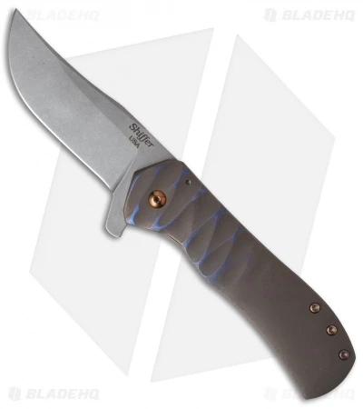 The Recon folder from Doc Shiffer Knives displays excellent build quality and smooth flipping action. This customized Recon features an upswept stonewashed blade and a bronze anodized titanium handle with blue accents. The handle sports a blue anodized pocket clip and bronzed hardware.
