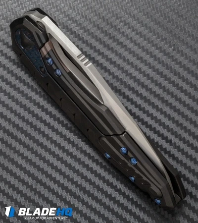 This Sigil has a DLC black finished 6Al4V titanium handle with blued titanium hardware and a blued Damascus steel stop plate. The backstrap has the Marfione Dagger, makers, serial number, and date of production. The blade is hand ground, hand rubbed Elmax steel.