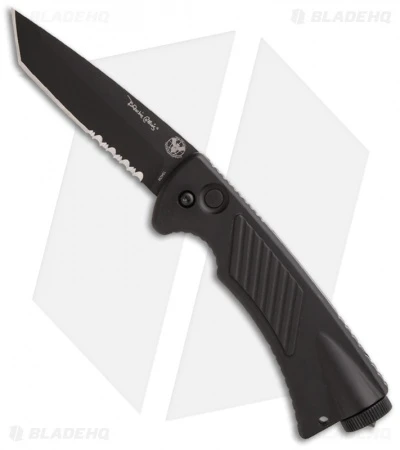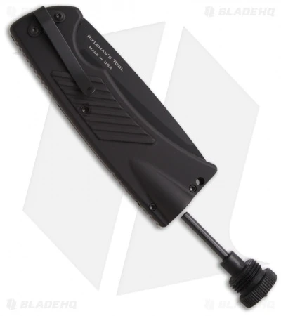 The Blackie Collins Rifleman from Meyerco is an automatic knife that has tools to service AR style platforms. The 6061-T6 aluminum handle has a threaded aluminum cap with a magnesium fire starter and sight adjustment tool. Tucked neatly into the spine of the handle is a stainless steel cartridge extraction tool with DLC coating. The extractor is held in place with the pressure fit from the machined aluminum cap that screws into the handle. This knife also features a 154-CM stainless steel tanto blade (partially serrated), tip-down pocket clip and tungsten carbide glass breaker tip.