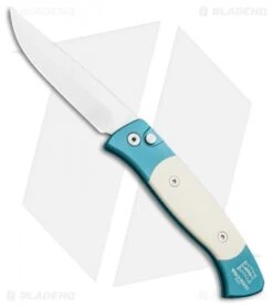 This Tuxedo style Brend 2 automatic knife has a satin finished 154CM steel blade and teal anodized T6 aluminum body with ivory Micarta inserts, satin hardware and a black pocket clip.
