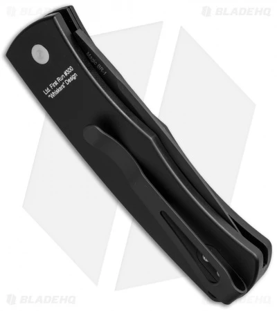 The Magic BR-1.7 has a black finished, partially serrated 154-CM steel blade and black anodized 6061-T6 aluminum handle with a patterned bolster release.