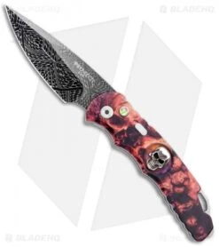 This TR-5 automatic model has a custom red skull anodized aluminum handle with a Bruce Shaw designed sterling skull inlay, mother of pearl push button, and a deep carry tip-up pocket clip. Its blade is made from Damascus Steel. A sliding safety lock allows secure pocket carry and prevents accidental blade deployment.