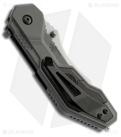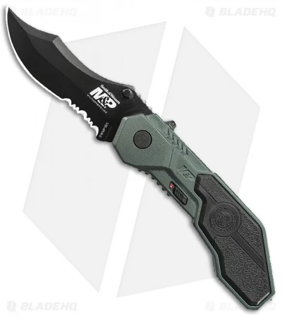 The SWMP1BS has a gray T6061 aluminum handle with rubber inserts. It sports a black finished 4034 steel clip point blade with a partially serrated cutting edge. Includes pocket clip, safety, and glass breaker.
