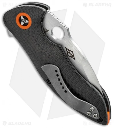 The Rubicon is a captivating flipper from Spyderco that leverages Peter Carey’s custom knife design. Spyderco has kept it authentic to the original while outfitting it with a flipper and their trademark round Spydie hole. The Rubicon excites with its contoured carbon fiber handle, titanium liners, orange G-10 back spacer, and pivot accent.