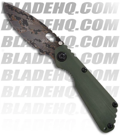 The SnG CC DIGI is another prime example of the quality and craftsmanship you can expect from Strider Knives. The CPM S30V blade is flat ground and is razor sharp with proprietary digi camo finish. The digi camo finish is stunning and quite a site to behold, they did a bang-up job on this one. The front is marked “STRIDER” and the back has the logo. Includes dual heat treated stainless steel thumb studs and oval thumb hole opener. The top of the knife features thumb ramp notching where the frame meets the blade spine for extra grip.