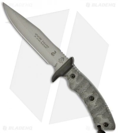 The Apache Falcon from TOPS Knives is a large fixed blade with a gray coated 1095 steel clip point style blade that measures in at over 6 inches. The handle is fitted with Rocky Mountain Tread textured Micarta scales. The choil allows the user to comfortably choke up on the blade for detailed tasks. The Apache Falcon comes in a tough nylon sheath with an buckled external pocket for additional items.