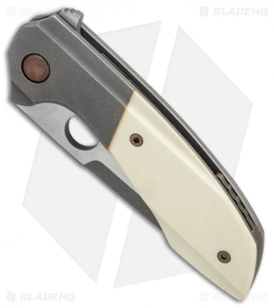 The TuffKnives Custom Catalyst V from Geoff Blauvelt offers EDC perfection for the seasoned collector. This flipper knife has a comfortable, bead blast/tumbled titanium frame lock handle fitted with a Westinghouse Micarta front scale. The drop point blade is made from CPM-154 with an impressive two-tone finish. A bronze anodized titanium pocket clip and back spacer finish off this flawless custom design.